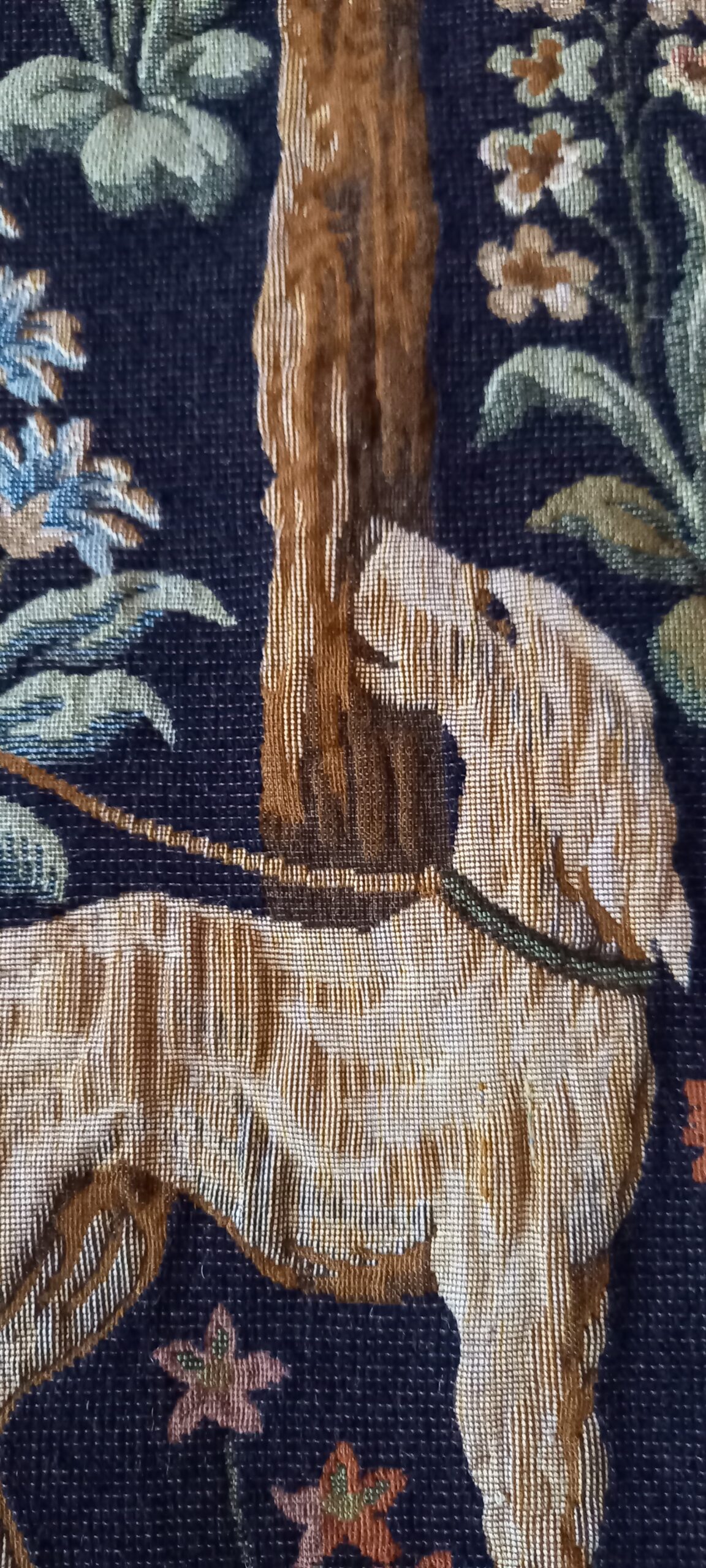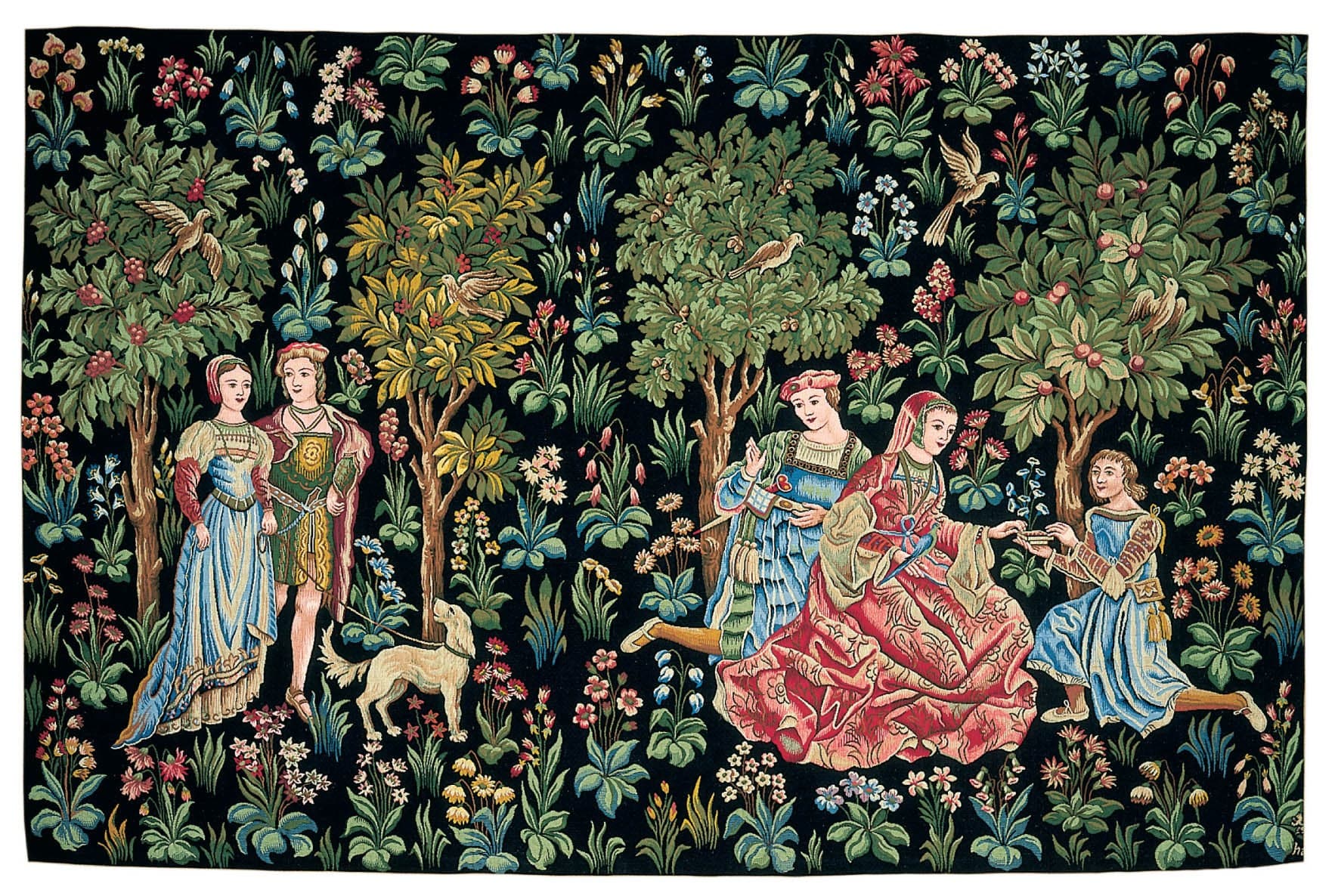 This tapestry is woven from an early 15th-century hanging. It shows a lady receiving a casket from her page, set against a backdrop of foliage and flowers, with a couple walking towards the lady and page. All the characters are dressed in Italian style, a fashion introduced in France after Charles VIII conquered Naples in 1495. This tapestry was woven on a Jacquard loom in 1983 in a factory in northern France. It belongs to a private individual who wishes to sell it. It is in very good condition. Lined tapestry with Certificate of Authenticity. Ready to hang.