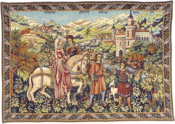 La tapisserie « L’après-midi du Duc de Berry » est une mise en scène de Jean de France. Il est connu pour avoir légué à la postérité de magnifiques manuscrits enluminés et illustrés par les artistes de l’époque. Ces livres de prières changeaient suivants les saisons, utilisant différents thèmes, divertissements ou travaux mettant en scène le Duc lui-même. C’est dans cet esprit que cette tapisserie a été réalisée, illustrant le mois de mai qui est traditionnellement le mois des amours.