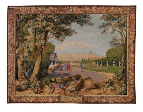 Cette réalisation reprend une œuvre des Gobelins intitulée l' »Automne », d’après un dessin de Le Brun. Le thème s’inspire des jardins animés du château de Versailles. Sur demande, cette tapisserie existe également sans les personnages.
